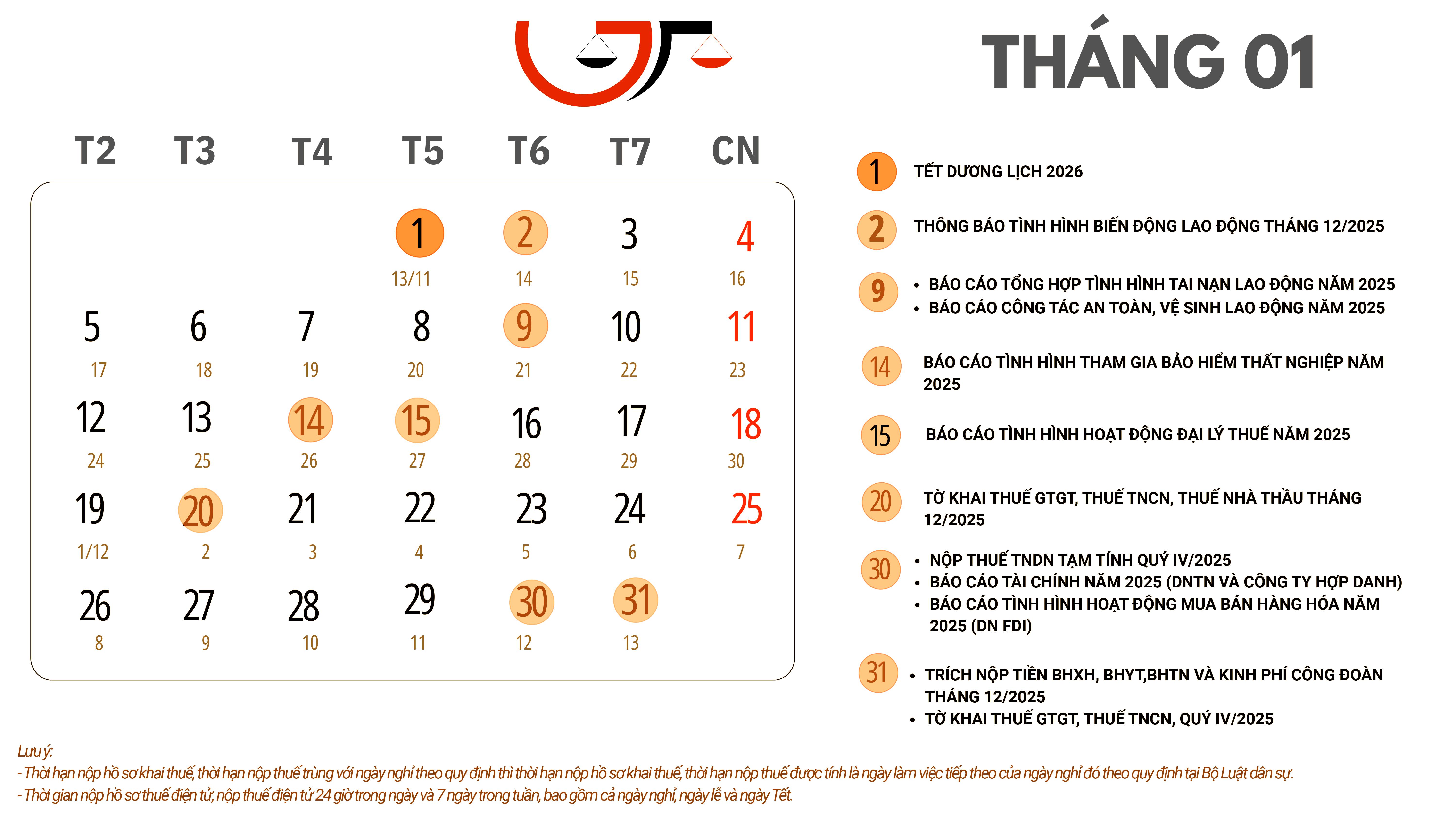 Dưới đây là Lịch pháp lý Kế toán – Nhân sự năm 2026 do Luật Gia Bùi tổng hợp, giúp doanh nghiệp chủ động theo dõi, thực hiện đúng – đủ – kịp thời các nghĩa vụ bắt buộc trong năm.